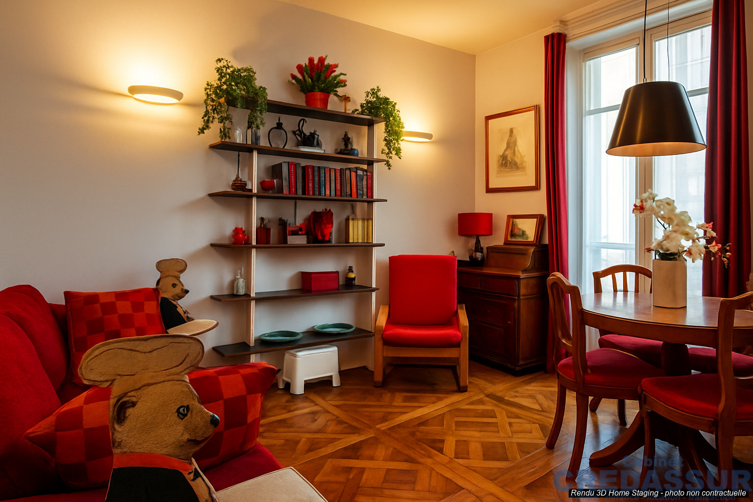 Ce charmant appartement avec près de 3m de hauteur sous plafond est situé en rez-de-chaussée et se compose d'une entrée, d'un séjour avec un magnifique parquet Versailles, d'une cuisine entièrement équipée semi-ouverte sur le séjour, d'une chambre avec placard dressing et d'une salle de douches avec wc. Très grande cave en sous-sol.